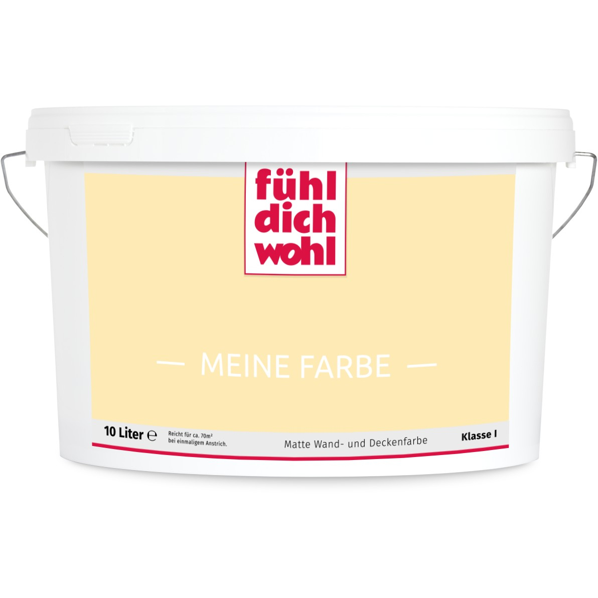 Fühl Dich Wohl "MEINE FARBE" ist eine Dispersionsfarbe mit höchstem Deckvermögen in Ihrem ausgewählten Farbton. Deckt beim einmaligen Anstrich. Spezielle Rezeptur für tropfarmes Verarbeiten.