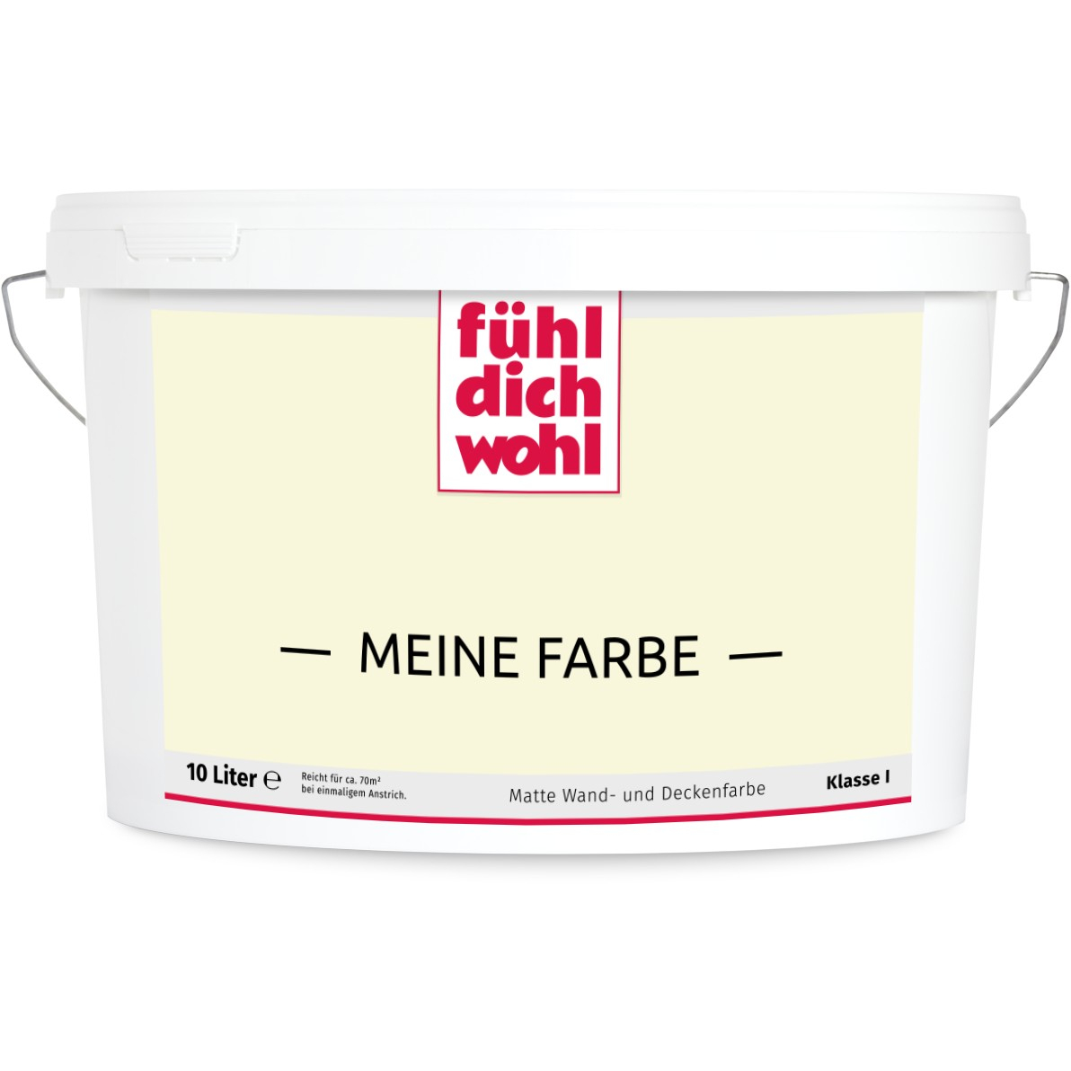 Fühl Dich Wohl "MEINE FARBE" ist eine Dispersionsfarbe mit höchstem Deckvermögen in Ihrem ausgewählten Farbton. Deckt beim einmaligen Anstrich. Spezielle Rezeptur für tropfarmes Verarbeiten.